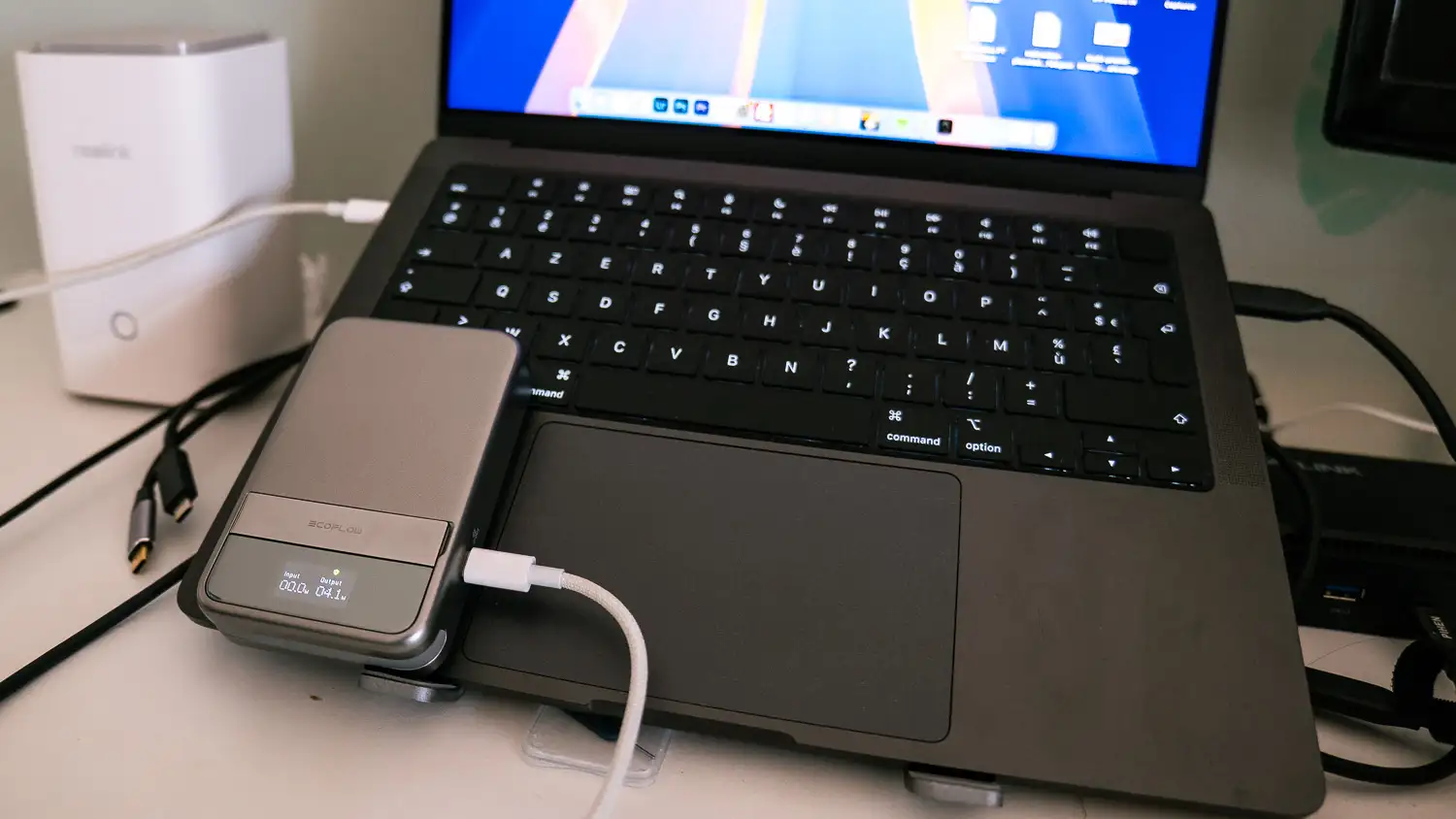 Pour aller plus loin, j’ai voulu tester la batterie avec un MacBook Air M1. Et là, surprise : en test réel, la batterie envoyait 32W, ce qui permettait de recharger correctement le MacBook. Plutôt satisfaisant.